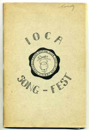 PDF of the scanned pages. IOCA Song Fest. intercollegiate Outing Club Association -- 1932. I. O. C. A. SONGS PAGE I. O. C. A. SONG........................ 3 Abdullah Bulbul Ameer ..................... 4 About the Year of One B.C..................... 5 Ain't Gonna Grieve My Lord No Mo'............... 6 Alexander's Rag Time Band................... 7 Alone, Tee Hee, Alone.................... . 8 Alouette............................ 8 Anne Boleyn.......................... 7 Annie Laurie.......................... 10 Antoinette Burby........................ 9 Auld Lang Syne......................... 10 Mules . ........................... 10 Advertise.......................... 10 Australia ........................... 8 Baby Died, Our......................... 11 Beer Bottle, The........................ 11 Bell Bottomed Trousers..................... 11 Bells of St. Mary's, The.................... 11 Bill.............................. 12 Bold Bad Man.......................... 13 Bowery, The........................... 12 Bring Back My Bonnie To Me................... 12 Build A Bungalow, We'll ... '................. 12 Bull-Dog on The Bank...................... 13 Caissons............................ 14 Capitol Ship, A........................ 14 Carry Me Back to Old Virginny................. 15 Casey Jones.......................... 16 Chanson Du Pinard . ..................... 6 Chewing Gum.......................... 17 Circus Queen, My.......................... 17 Clementine.......................... 17 Coast of High Barbary, The ................... 18 Cocaine Bill.......................... 19 Constantinople......................... 20 Cowboy Fireman, The...................... 19 Cufusalem........................... 21 Daisy, Daisy.......................... 20 Dark Town Strutters Ball........ . . ......... 20 Darkey Sunday School..................... 21 Dese Bones Gwine Rise Agin................... 23 Did You Ever Think When the Hearse Goes By........... 24 Dinah......... .................... 23 Down By The Old Mill Stream.................. 24 Down In The Valley . ...................... 24 Drink To Me ......................... . 24 Drunken Sailor, The...................... 25 Drunk Last Night . . ...................... 25 Dutch Company, The....................... 25 Dying Fisherman's Song, The .................. 26 Dying Hobo, The........................ 26 Eight Bells.......................... 27 Family Rattin, The ....... ................ 27 Fee-Fi-Fiddlee-I-0....................... 28 Fol De Rol.......................... 28 Frankie and Johnnie...................... 29 Frog He Would A-Wooing Go................... 28 Frog He Are A Queer Bird, The................. 30 Gallant Ship, Our....................... 30 Gay Caballero, The....................... 32 Index (Continued PAGE Girls Can Never Change Their Nature.............. . 31 Girl Like Me, A ... ...................... 32 Go Down Moses.......................... 33 Golden Slippers, Oh Dem ............. ........ 33 Good Night Ladies........................ 34 Grandfather's Clock....................... 34 Gretchen............................ 35 Hail, Hail, The Gang's All Here................. 36 Ham And Eggs.......................... 36 Hambone Am Good........................ . 36 Hand Me Down My Walkin' Cane.................. 36 Hanover Winter Song ...................... . 38 Hell To The Skier ....................... 37 Home On The Range........................ 38 Home James, And Don't Spare the Horses ...... ...... . 39 Horses Run Around, The..................... 40 I Am A Student At Cadiz..................... 40 I Got Shoes........................... 42 I Learned About Women Prom Her................. 40 I Like Mountain Music....................... 45 I'm A Son of A Gun For Beer................... 41 The Spider.......................... 42 In Eleven More Months And Ten More Days............. 44 In The Evening By the Moonlight................. 46 I Run The Old Mill....................... 45 I Want A Girl........................... 46 I Was Born About A Thousand Years Ago.............. 42 I With I Were A Wittle Thugar Bun................ 43 I Wonder Who's Kissing Her Now................. 43 Jesse James........................... 46 Jingle Bells . . . ....................... 46 Johnny Vorbeck ............... ..... ..... 47 Juba............................. 47 Julia ............................. 47 Katy............................. 47 Keep In The Middle Of The Road................. 47 Kentucky Home......................... 48 Kitty .... ......................... 48 Landlord Pill The Plowing Bowl................. 48 Lavender Cowboy, The...................... 49 Let Me Call You Sweetheart.................. 50 Lazy Bones.......................... . 49 Little Brown Jug........................ 50 Little Joe The Wrangler..................... 51 Liza . . . ........................... 50 Look Down ............................ 51 Lord Jeffrey Amherst.................. 52 Love's Old Sweet Song...................... 52 Lydia Pinkham........................... 52 Mad Dogs And Englishmen.................... 54 Mammy Don't Want No Beer.................... 53 Man On The Flying Trapeze, The................. 55 Mandalay................ .... ........ 56 Martins And The Coys,'The.................... 56 Massa's In De Cold Cold Ground................. 58 McSorley's Twins........................ 58 Me And Marie.......................... 53 Merrily We Roll The Keg..................... 34 Michael Finnigan........................ 53 Moonlight Bay.......................... 55 Moosilauke Sweetheart ............... ....... 59 Index (Continued) PAGE Mrs. Murphy's Chowder........................ 60 Mug Song, The ......................... 59 Muss I Den Zum Stadtle Naus................... 60 My Mother-In-Law ........................ 61 My Mother Told Me Not To Smoke...........,...... 61 My Name Is McNamare....................... 61 Nine Men Slept In A Boarding House Bed............. 6