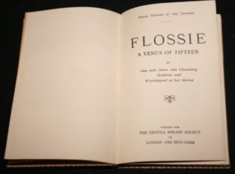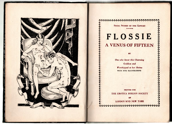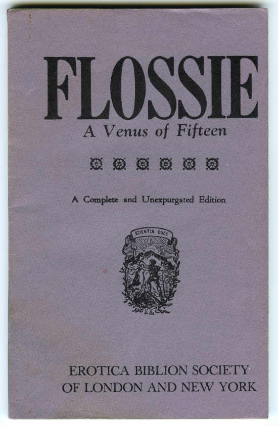 Flossie: A Venus of Fifteen was originally published in 1897. A description of the book can be found in Carrington's 1902 catalog Forbidden Books: Social Studies of the Century. Flossie: A Venus of fifteen, by one who knew this charming goddess and worshipped at her shrine. Printed at Carnopolis for the delectation of the amorous and the instruction of the amateur in the year of excitement of the sexes: MDCCCXCVII. Large 8vo. This is the first edition of a very amusing and remarkable volume, which was printed at Amsterdam for the author in the latter half of the year 1897. Unlike many works of its kind, it is composed with no mean ability and it is easy to see that a cultured hand has tapped the typewriter. The book has no other pretension than to be thoroughly obscene, as it recounts the adventures of a immature young person of distinct cockney type, who begins to fully satisfy her male admirers at a very early age, and manages to retain her physical virginity until the last few pages. I think that no modern volume of this kind has ever had so much success. The first and limited edition was soon sold out, but it was immediately reprinted, “for the Erotica Biblion Society of London and New York,” n.d. (Paris, 1898), small 12mo. of 122 pp., and there are two or three more re-issues. It seems to be almost always in demand and I do not think I am exaggerating when I say that two or three thousand copies have been sold, since it first saw the light. The original, which is beautifully printed on very fine paper, under the loving superintendance of the author, a noted English novelwriter, had become excessively rare. The ordinary reprints are now offered in Paris and London are all very badly got up. The prospectus too, which was from the pen of the creator of this wonderful creature, who really existed in the flesh—very much in the flesh is more diflicult to find than the fine first issue, and so I venture to reproduce it here, as it is a pity that such a peculiar fragment of literature should be lost to our grandsons, and—dare I say it 'I—grandaughters too.