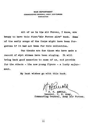 WAR DEPARTMENT COMMANDING GENERAL., ARMY AIR FORCES WASHINGTON All of us In the Air Forces, I know, are happy to have this first'♦Air Forces Airs'* book. Some of the early songs of the Corps might have been for- gotten if it had not been for this collection. Our thanks are due those who have made a record of what airmen have been singing. It will bring back good memories to some of us, and provide for the others - the new young flyers - a lusty enjoy-* ment, My best wishes go with this book. '' R. H. ARNOLD, ^\ General, U. S. Army, X Commanding General, Army Air Forces. hi