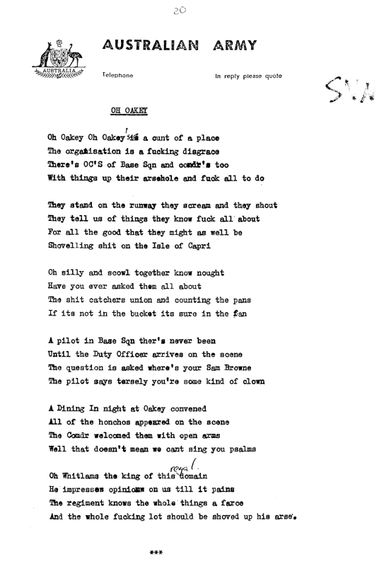 reply please quote OH OAKET T Oh Oakey Oh Oakey *i£ a cunt of a place The organisation is a fucking disgrace There's OCfS of Base Sqn and eon&fe'a too With things up their arsehole and fuck all to do They stand on the runway they scream and they shout 5Rxey tell us of things they know fuck all about For all the good that they might as well be Shovelling shit on the Isle of Capri Oh silly and scowl together know nought Hare you ever asked them all about The shit catchers union and counting the pans If its not in the bucket its sure in the fan A pilot in Base Sqn therfg never been Until the Duty Officer arrives on the scene The question is asked where fs your Sam Browne Qhe pilot says tersely youfre some kind of down A Dining In night at Oakey convened All of the honchos appeared on the scene The Coadr welcomed them with open arms Well that doesnft mean we cant sing you psalms refL i Oh Whitlams the king of this domain He impresseB opinio©* on us till it pains Bie regiment knows the whole things a farce And the whole fucking lot should be shoved up his arse4* w u v