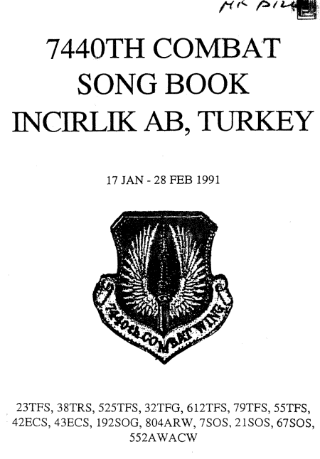 Below is the raw OCR output of 7440th Combat Song Book Incirlik AB, Turkey 17 Jan-28 Feb 1991.  If you wish to verify the text, please download the PDF of the scanned pages.
