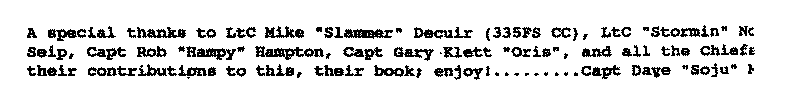 This book contains our thoughts, our songs and our games. Lesser individuals who have never strapped their asses to a piece of flaming metal and hurled their bodies through the dead of night, skimming Terra Firma, will consider it of little or no redeeming social value. For this reason the contents of this book are held sacred by those of us who have; and need not concern those who do not and will not know what it means to fly a fighter.