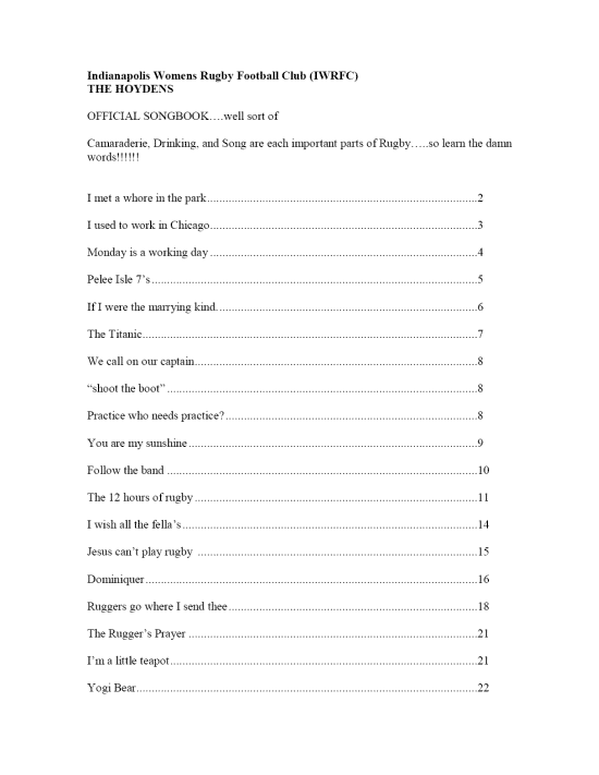 hear a tale A tale of a rugby team A trip from Indy to Canada With a drunken theme The Hoydens make the long trip every year For Pelee 7's. To deprive ourselves of sleep and put Our livers to the test, our livers to the test The border patrol started getting rough They said rugby teams are banned Now we sign in as handball players who Have rugby balls in hand, have rugby balls in hand Like years before we will perform The usual tournament tricks Like drunkenness The stripper, too A million beers Someone's