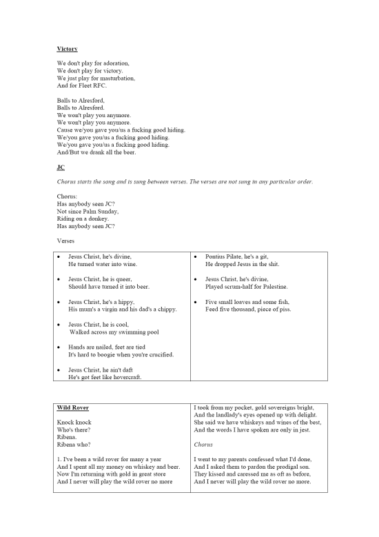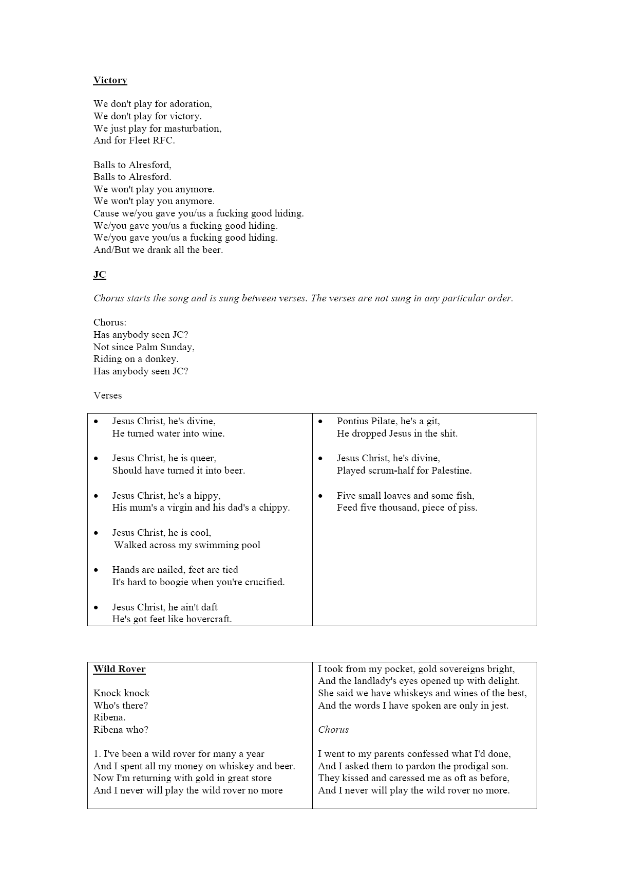 We don't play for adoration, We don't play for victory. We just play for masturbation, And for Fleet RFC. Balls to Alresford, Balls to Alresford. We won't play you anymore. We won't play you anymore. Cause we/you gave you/us a fucking good hiding. We/you gave you/us a fucking good hiding. We/you gave you/us a fucking good hiding. And/But we drank all the beer.