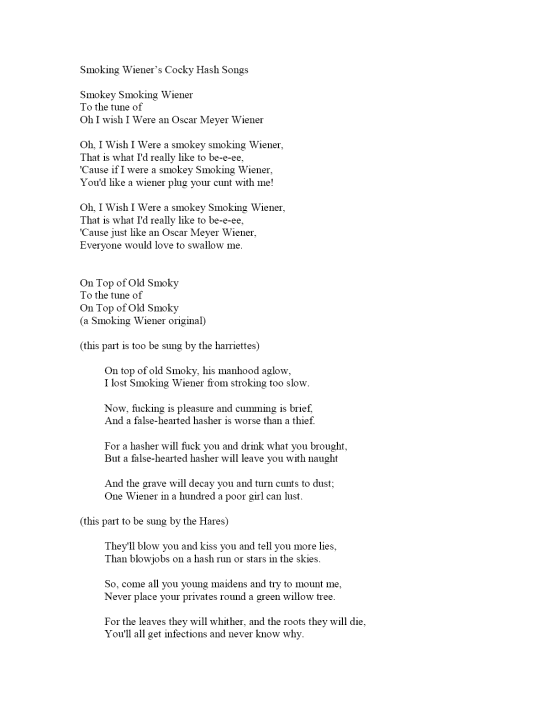Below is the unformatted text of Smoking Wiener's Cocky Hash Songs. If you