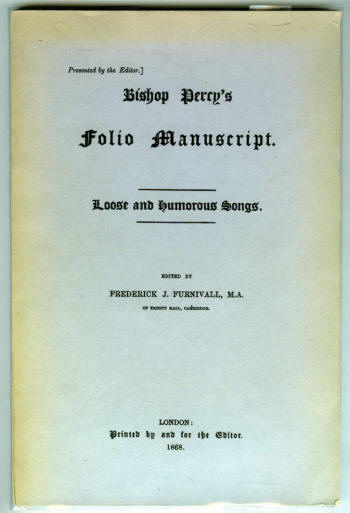 This is the 8vo original wraps edition issued by Furnivall in 1868 of Bishop Percy's Folio Manuscript perhaps as a way to market the less "loose" volumes. Presented by the Editor.] LOOSE AND HUMOUROUS SONGS. EDITED BY FREDERICK J. FURNIVALL, M.A. OF TRINITY HALL, CAMBRIDGE. LONDON: Printed by and for the Editor. Bishop Percy's This long hidden MS., the foundation of the celebrated PERCY'S Large 4to., on Whatman's Best Ribbed Paper, made Extra Royal 8vo., on Whatman's Best Ribbed Paper. The following editions of the BALLADS and ROMANCES, 3 vols.. Extra Demy 8vo., on Whatman's Ribbed Paper. (250 Demy 8vo. (1,000 copies printed: 275 on sale)........... 2 2 Subscriptions should be sent, with Subscribers' Narnes, to P. J. Furnivall,
