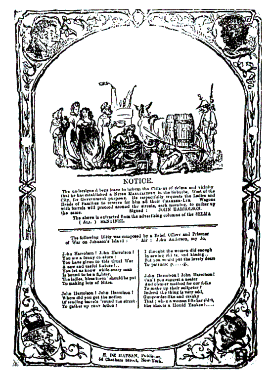 John Harrolson! John Harrolson! Where did you get the notion Os sending barrels 'round the street To gather up THAT lotion! I thought the women did enough In sewing shirts and kissing.. But you would put the lovely dears To patriotic pissing