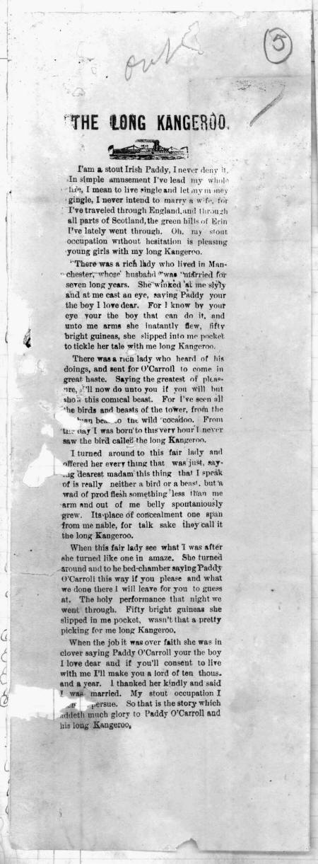 "There was a rich lady who lived in Mnn- ■■ chester'.-whose' husband *wa* "nlarried for seven long years. She winked 'at mo slyly and at me cast an eye, saying Paddy your the boy 1 love dear. For I know by your eye your the boy that can do it, mid unto me arms she inatantly flew, fifty bright guineas, she slipped into me pocket to tickle her tale with me long Kangeroo.