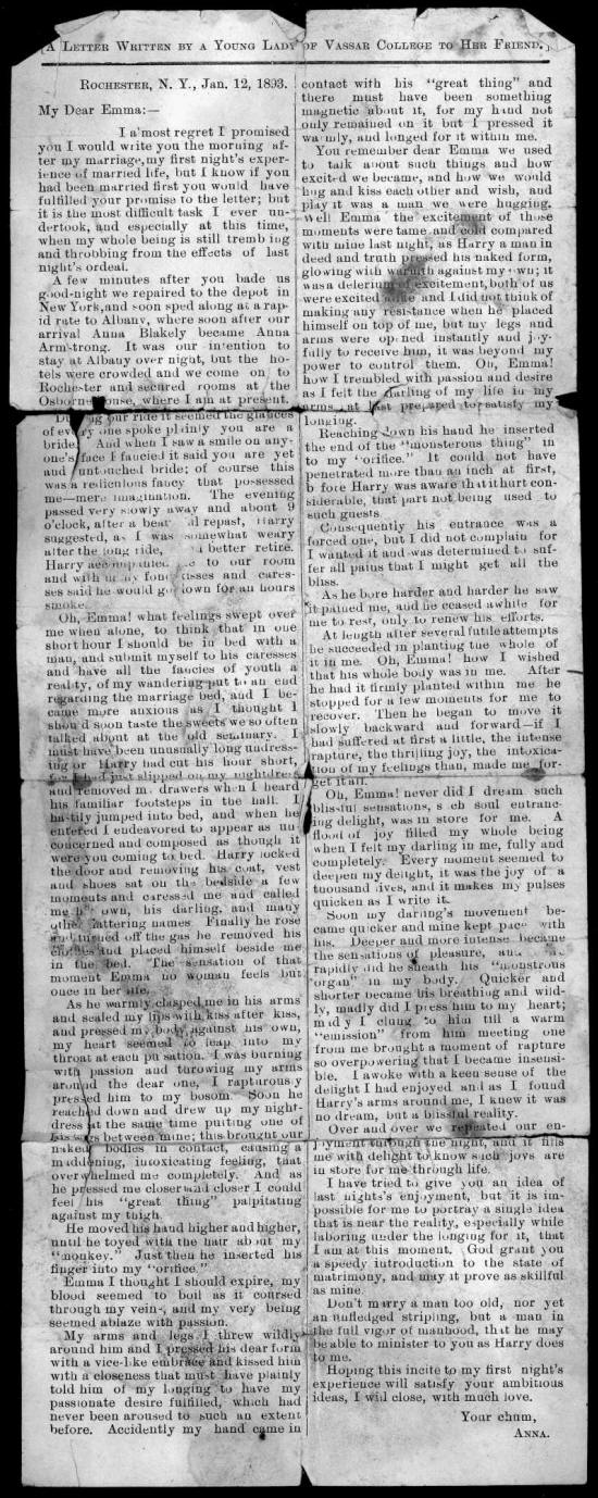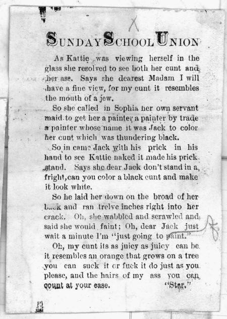 As Kattie was viewing herself in the glass she resolved to see both her cunt and^ > jier -ase. Says she dearest Madam I will thave a fine view, for my cunt it resembles the mouth of a jew.