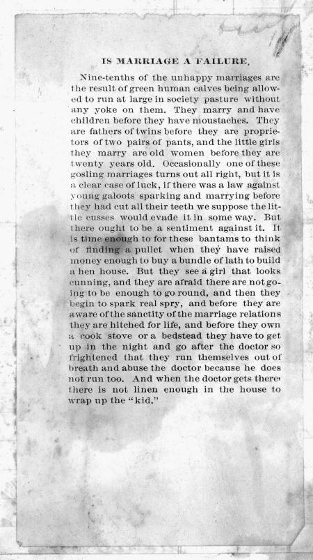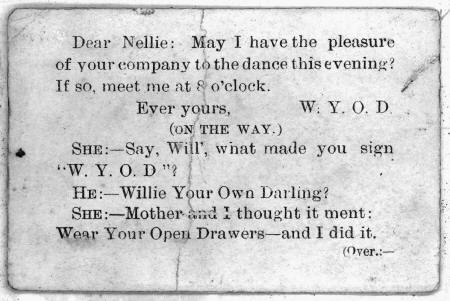 He:—Willie Your Own Dai ling? She:—Mother and I thought it ment: Wear Your Open Drawers—and I did it.