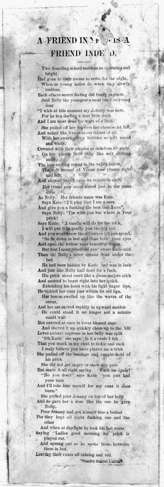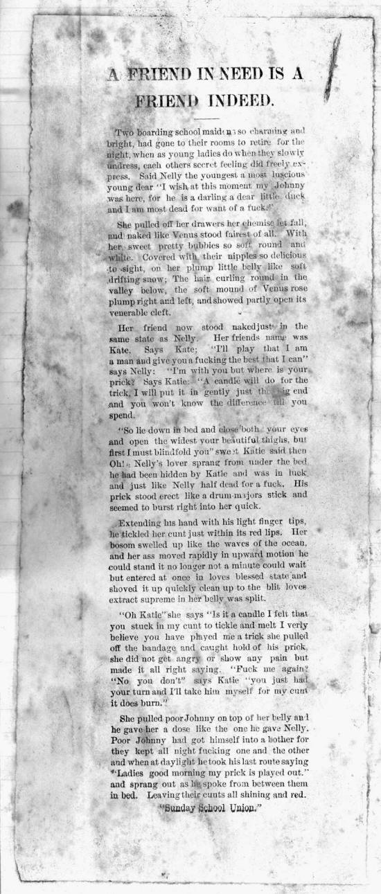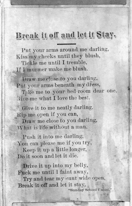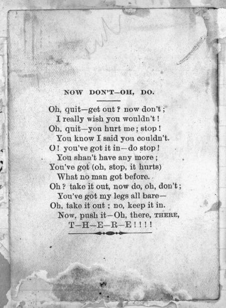 Put your arms around hie darling, Kiss my cheeks untill they blush, Tickle Die until! I tremble, If I muruier make me blush. Draw me close to you darling, Put your arras beneath my dres^? 'Take me to your bed-room dear one, Give me what I love the best. €Jiw it to me neatly darling, Rip* me open if yo*i can, IMraw me close to you darling, What is life without a man. iPush it into me my darling, You can please me if you try, Keep it up a little longer, Do it soon and let it die. ;Vim 'it lip into my belly, Fuck me untill I faint away, Try and fear my cunt Wide open, Break it off and let it stay.