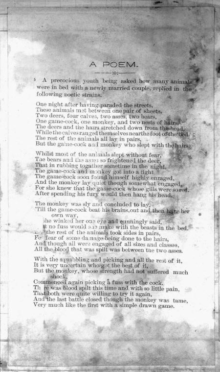 They both got excited and sli nek up a tight, Aud looked in the ve Bilaiul I. u d it nil li;,ht Then into their bed both •buileiy en pi, Aud, Hie llim; beta, over 1 boon tell asleep.
