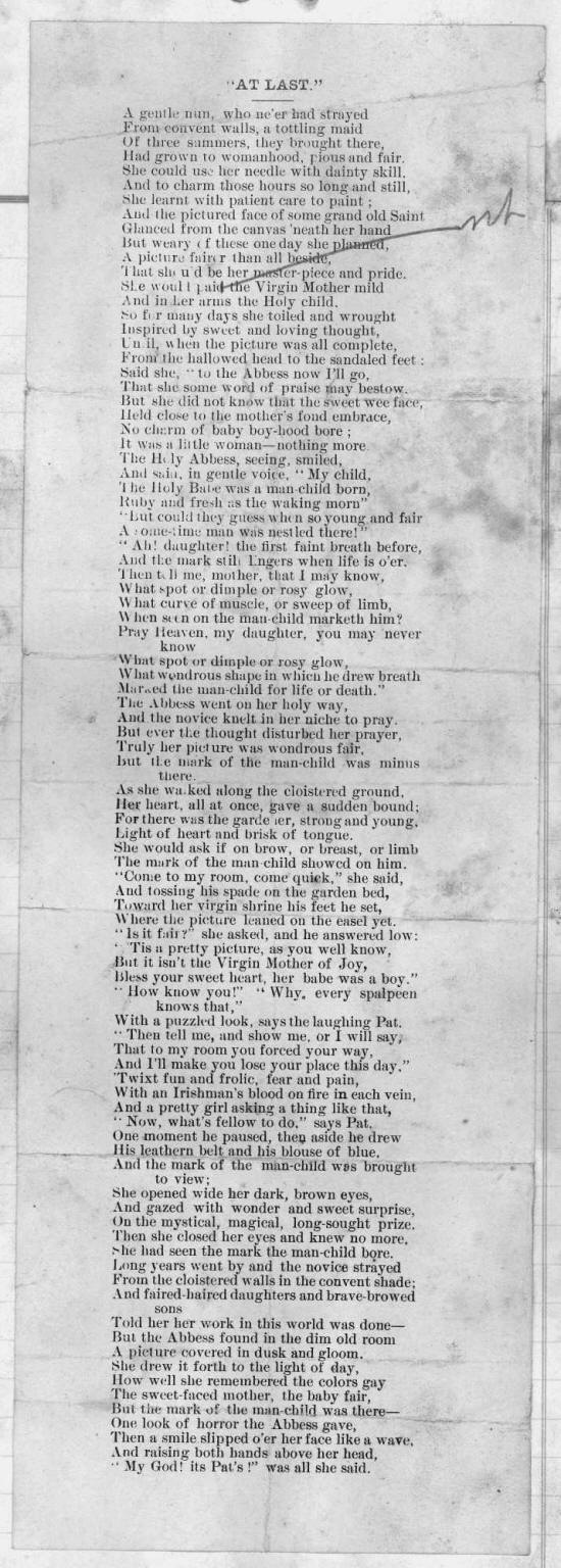 A drop of ink—how much it holds, Upon my pen point newly wet; A brilliant fancy it enfolds, Perhaps, U I could only get It rightly spread upon the sheet Of paper, spotless, free from staim— Alas! I gaze out in the street And chew my pen holder in vain.