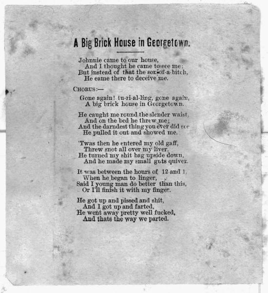 She once fucked a man till he dropped dead, She fucked all tho hair off Dave Hill's head. She gave Inspector Byrnes such a rub, His prick got limber so lie used his club. She crammed all the actor's on Union Square, She^fucked Hugh Grant in the mayor's chair. She fucked Boss Piatt till he lost his power, And she's laying for a whack at R. P. Flower. Ta-ra-ra Boom-ta-ree.