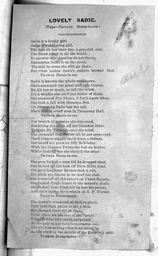 Sadie is known the whole world over, She's crammed our great and only Grover, He hit her so much, to tell the truth, It's a wonder she ain't the father of Ruth. She crammed Jim Blaine, I don't know when, She took a fall with Grandpa Ben. On cramming Sadie has the call, She's fucked every man in Tammany Hall, Ta-ra-ra Boom-ta-ree-
