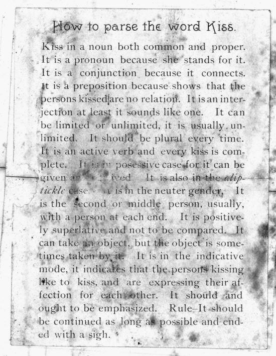 -?^iven 3? \ 'iVfid It is also inehe tiiip- tickle Jkse. >i is in the neuter gender. It is the 'Second or middle person, usually, with a person at each end. It is positive- ly sup.eri alive and not to be compared. It can take a;i object, but t«Keobject is some- times taken by, it. It is in the indicative mode, it indicates that the,person*^ kissing lfke to kiss, and are expressing their af- fection for eachvjbther. It should and ought to be emphasized. Rule-It should be continued as lon£ a&possible and end- ed with a sigh. * '. j a