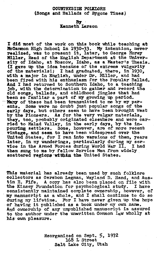 Home | Songs & Ballads (1930) | Songs of Eastern Idaho (1950) | Barnyard Folklore (1952) | Typical Specimens of Vulgar Folklore (1952) | Barnyard Folklore (1953) | The Folklore Trade with Gershon Legman (1962) | Countryside Folklore (1972) | What's New | Contact Us