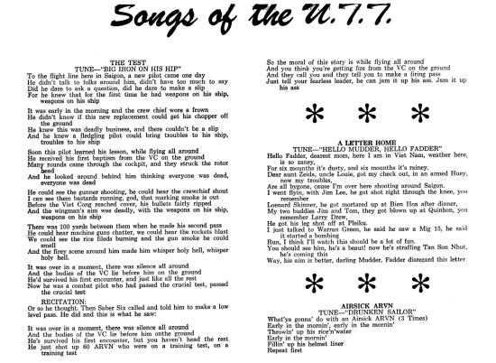 Home | 12 TAC FTR WG Song Book (1966) | 35th TAC Fighter Wing (1966) | Barracks Ballads (1966) | Bawdy Ballads from Ontario (1966) | Bottoms Up (1966) | Fifteen Plagues of the Maidenhead (1966) | Phantom Phlyers Sing Viet Nam (1966) | Songs of the UTT (1966) | Stag Party Humor (1966) | Uni Song Book (1966) | What's New | Contact Us