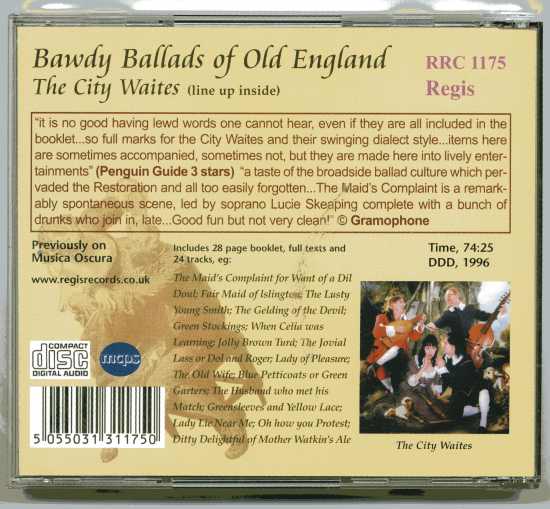 Bawdy Ballads of Old England / "The Mufitians of Grope Lane" / City Waites 'Extraordinary how potent cheap music is' remarked Noel Coward. By rummaging in the bargain basement of England's rich musical heritage, The City Waites have pulled out a priceless bundle - the forgotten penny broadsides and songs that were churned out in their thousands by the hacks of Seven Dials in Covent Garden, the Tin Pan Alley of 17th century London. Whatever its value at the time, the vitality and humour of this music transcends the centuries and now, it lives again. Broadside ballads, and the popular tunes to which they were sung, were everyday musical fare. Whistled and hummed in all walks of life from courtier to ploughman, they were as likely to be bought for domestic amusement as pinned up on a tavern wall where they were often used to keep out a draught!. The songs on this recording, however, served yet another purpose: to complement a lewd scene in a theatre, to cozen a market-place gathering, or generally to 'stir up unchaste thoughts' in taverns and bawdyhouses up and down the land. The street name Grope Lane - or sometimes Gropecuntlane - existed in a number of towns and parishes from medieval times and, while spellings varied, the message was unmistakable! This was the red-light district where whores plied their trade in brothels and stews (a stew, originally a steam-bath, was a legacy from the Romans, its association with brothels reinforced by the practice of sweating as a cure for venereal disease). Archives record a Gropecuntelane, dating back to the 13th century, in London's St Pancras district, and one in Oxford - now renamed Magpie Lane. In Northampton there was a Grappecuntelane; Wells in Somerset had its Gropecuntlane, while Chipping Barnet, Worcester, Bristol, Peterborough and York all had a Gropelane - the latter now renamed Grape Lane. In London, the suburb of Southwark became particularly notorious for the variety of pleasures on offer. Here, along the bank of the Thames not far from the Globe Theatre and Bear Gardens, huddled the famous Southwark stews, painted white and often sporting the suggestive sign known as The Cardinal's Hat. The Winchester Geese, as the local prostitutes were called (the land was once owned by the Bishop thereof), were permitted to sit outside provided they did not openly solicit or throw stones at unwilling passers-by. One such establishment is immortalised in the broadside ballad The Jovial Broom Man. It was owned by the undisputed 'princess of whoredom' Donna Britannica Hollandia and became affectionately known to its patrons as Holland's Leaguer - a punning reference to the Anglo Dutch wars of the 17th century. Rather than his brave military exploits, this is then the reason why the soldier in the song has returned home 'naked, hungry, cold and dry' - he has spent all his money at the whorehouse! Some prostitutes operated from the back rooms of ale-houses, welcome indeed since they increased business. In these low dives, often hidden away in ginnels and alleys, the less well off could dally with the most desperate drabs and jades. And in this seedy setting, musicians too had a part to play: Minstrels and itinerant ballad singers were seen by the authorities as 'toys to prick up wenches withal', since they were often used to whet the appetite of prospective clients with 'a ripe selection of bawdy songs, filthy ballads and scurvy rhymes, serving for every purpose and every company'. Prostitutes meanwhile, were able to explain away the presence of so many men by putting an 'instrument in sight to dazzle the eyes of every officer', claiming 'all that are lodged in the house by night, or frequent it by day, come hither as pupils to be well schooled [in music]'. One Mr Barnes of Bishops Stortford in Essex even set his young sons to singing in brothels where 'the one in squeaking treble, the other in an ale blown bass, they carole out such adultrous ribauldry as chaste ears abhor to hear and modesty hath no tongue to utter.' While they sang, the old man feigned admiration at 'the lascivious under-songs of Watkin's Ale' (Track 23 here), and others, sung with such 'detested boldness, as if there be one line in those lewd tongs than other more abhominable, that with a double repetition is loudly bellowed. The father leaps, the lubbers roar, the people run, the Devil laughs, God lowers and good men weepe'. There was a further connection between the ballad singer and the criminal underworld; Music was often used to engage the attention of the listener while another familiar character went about his business - the cutpurse or pick-pocket. Since an edict of Elizabeth I had effectively outlawed the more honest 'old-style' minstrels, ballad singing and ballad peddling was undertaken mainly by a class of dubious fellows who would work the streets, inns and country fairs. Like Shakespeare's Autolycus, they usually sold copies of the ballads they sang and, like him, had any number of roguish tricks: gathering a large and eager crowd they might sing the first part of a long ballad (like The Gelding of the Devil), Stop it the most exciting bit - and then demand money to finish the story! Another ploy involved working with a confederate and shouting 'Ladies and gentlemen, look to your purses - there are pickpockets about!' at which cry, members of the crowd would pat their pockets, instantly revealing to the swift-fingered cutpurses the whereabouts of valuables! The Bishop Stubbes heartily condemned the whole 'tribe' of them as 'drunken sockets and bawdy parasites... singing of unclean, corrupt and filthy songs'.