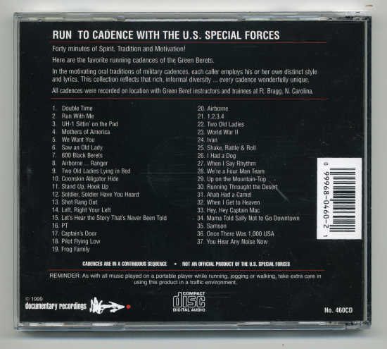 Home  |  Run to Cadence with the Army Airborne (1996)  |  Run to Cadence with the Army Infantry (1996)  |  Run to Cadence with the Army Rangers (1996)  |  Run to Cadence with the Green Berets (1996)  |  Run to Cadence with the US Navy (1996)  |  Run to Cadence with the Navy Seals (1996)  |  Run to Cadence with the Marines, Vol. 1 (1998)  |  Run to Cadence with the Marines, Vol. 2 (1998)  |  Run to Cadence with the Marines, Vol. 3 (1998)  |  Run to Cadene with the US Army Airborne Rangers (1998)  |  Run to Cadence with the Recon Marines (1998)  |  Run to Cadence with the US Armed Forces (1998)  |  Run to Cadence with the US Navy, Vol.2 (2004)  |  What's New  |  Contact Us