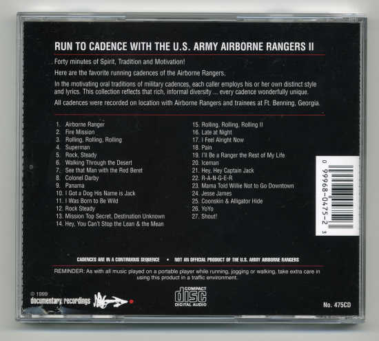 Home | Run to Cadence with the Army Airborne (1996) | Run to Cadence with the Army Infantry (1996) | Run to Cadence with the Army Rangers (1996) | Run to Cadence with the Green Berets (1996) | Run to Cadence with the US Navy (1996) | Run to Cadence with the Navy Seals (1996) | Run to Cadence with the Marines, Vol. 1 (1998) | Run to Cadence with the Marines, Vol. 2 (1998) | Run to Cadence with the Marines, Vol. 3 (1998) | Run to Cadene with the US Army Airborne Rangers (1998) | Run to Cadence with the Recon Marines (1998) | Run to Cadence with the US Armed Forces (1998) | Run to Cadence with the US Navy, Vol.2 (2004) | What's New | Contact Us