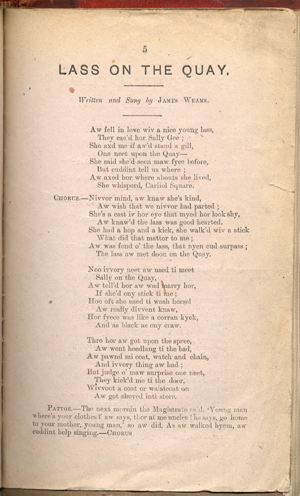 Nivvor mind, aw knaw she's kind, Aw wish that we nivvor had parted; She's a cast iv hor eye that myed hor look shy, Aw knaw'd the lass was good hearted, She had a hop and a kick, she walk'd wiv a stick What did that mattor to me; Aw was fond o' the lass, that nyen cud surpass; The lass aw met doon on the Quay. Noo ivvory neet aw used ti meet Sally on the Quay, Aw tell'd hor aw wad marry hor, If she'd ony stick ti me; Hoo oft she used ti wash horsel Aw really divvent knaw, Hor fyece was like a corran kyek, And as black as ony craw. Thro hor aw got upon the spree, Aw went heedlang ti the bad, Aw pawned me coat, watch and chain, And ivvory thing aw had; But judge o' maw surprise one neet, They kick'd me ti the door, Wivvoot a coat or waistcoat on Aw got shoved inti store. PATTOR The next mornin the Magistrate said, "Young man, where's your clothes?" Aw says, thor at me uncles! He says, 'Go home to your mother, young man," so aw did. As aw walked hyem, aw cuddint help singing.—CHORUS |