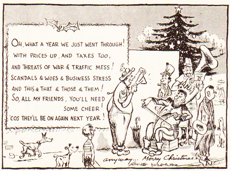 Subject: RE: Happy Holidays!! From: Sandra in Sydney Date: 18 Dec 15 - 07:22 PM my 2015 christmas card This cartoon was drawn in the 1950's by one of my favourite Australian cartoonists, Emile Mercier Happy New Year! sandra |